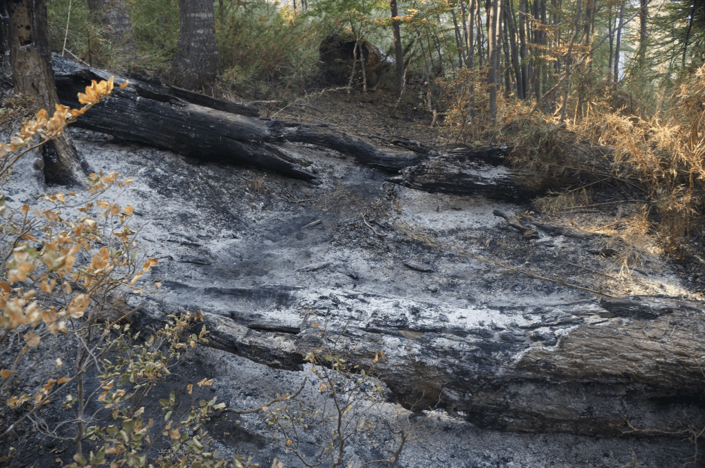 (2) Detalle de una “mota” de suelo de ceniza volcánica quemado, de alta combustibilidad por su porosidad y con altos índices de materia orgánica – entre 20 y 30% en los primeros 50 cm. Si bien su rico contenido mineral y porosidad permite su rápida recuperación, será necesario evaluar el daño efectivo de este evento en primavera, con el bosque rebrotado.