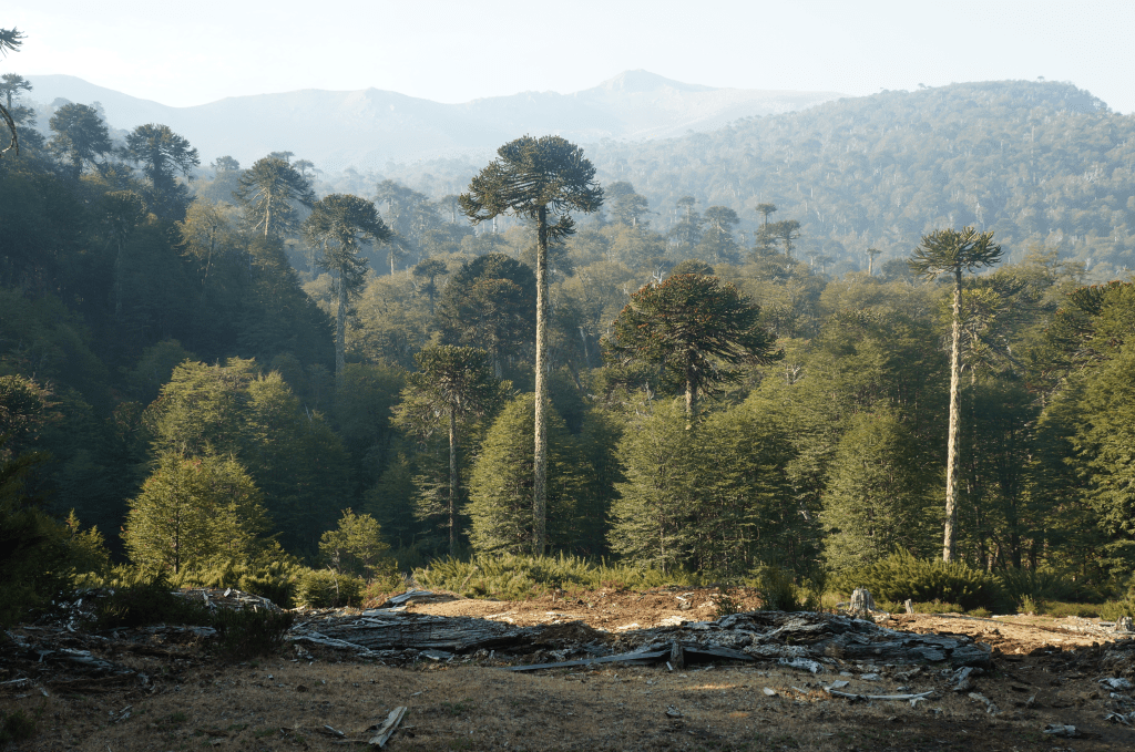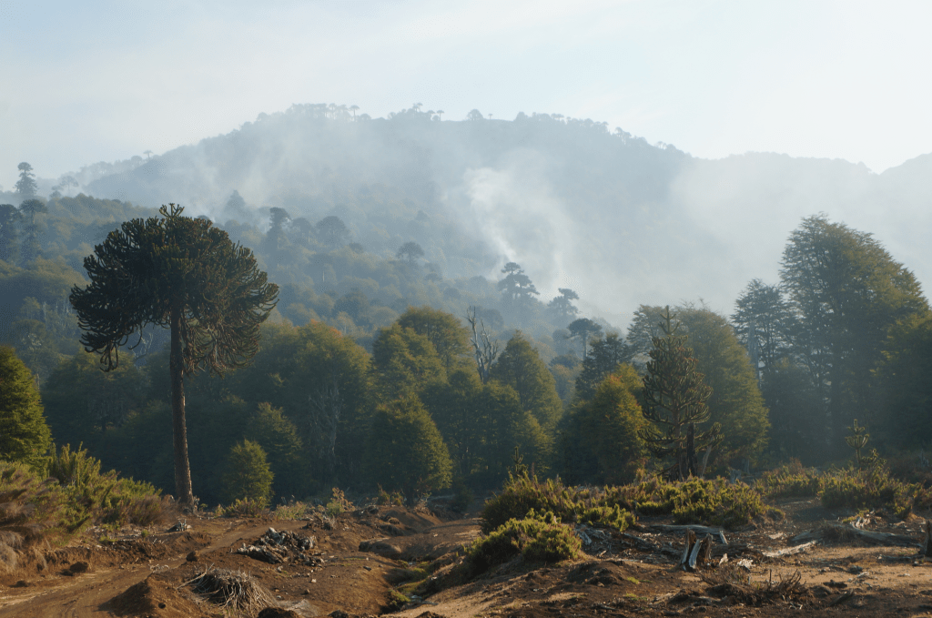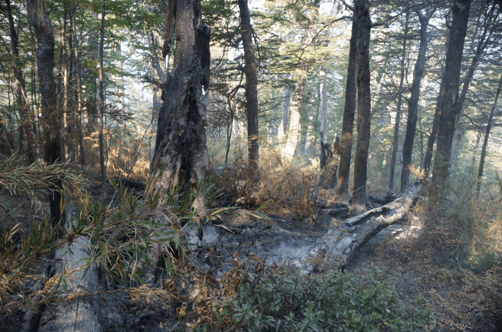 (1) Entrada al Cajón Coihueco en Miraflores, correspondiente al predio de la Comunidad Indígena de Quinquén. La imagen da cuenta de las características del incendio de la Reserva China Muerta, subterráneo y que se propaga por el suelo entre 30 a 60 cm de profundidad, lo que determina la presencia de humo en el aire, la expansión lenta del mismo a no ser que las condiciones del viento cambien (el registro corresponde a un día calmo) y una característica de propagación moteada, donde la mayoría de los árboles debiera quedar vivo.