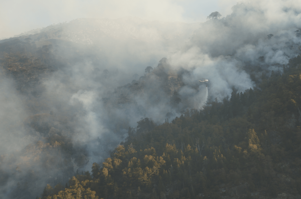 (6) Panorama del frente sur del incendio, un sector con topografía muy abrupta donde el control sólo puede ejecutarse desde el aire, tarea que está siendo desarrollada por tres helicópteros que, al utilizar agua del sector llamado Cabeza de Indio, desarrollan una rotación efectiva de 10 a 15 minutos por nave y una frecuencia de tiro de al menos 5 minutos entre los tres.