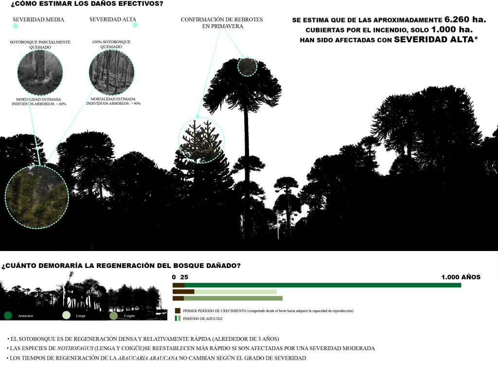 (3) Estimación del período de restauración ecológica tras el incendio en el Parque Nacional Conquillío y Reserva Nacional China Muerta. La afirmación de la superficie efectivamente dañada con severidad alta corresponde a Leonardo Araya, Ingeniero Forestal. Toda la información técnica restante en Mauro E. González, Michelle Sznejer, Ariel A. Muñoz y Jorge Silva, “Incendios Catastróficos en Bosques Andinos de Araucaria-Nothafagus: Efectos de la Severidad y Respuesta de la Vegetación” en Agrupación de Ingenieros Forestales por el Bosque Nativo (2015), http://www.bosquenativo.cl/descargas/Revista_Bosque_Nativo/RBN_46_art_tec2web.pdf (consultado el 08 de Agosto del 2015)