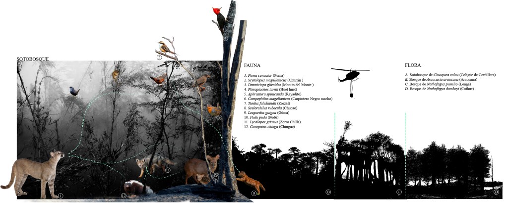 (2) Ecologías afectadas por el incendio en el Parque Nacional Conquillío y Reserva Nacional China Muerta. Dado el carácter subterráneo del evento, la comunidad ecológica afectada por el incendio corresponde mayoritariamente al sotobosque, aquel definido por el conjunto de arbustos, matorrales y hierbas que crece más cercano a la superficie y bajo el dosel arbóreo.