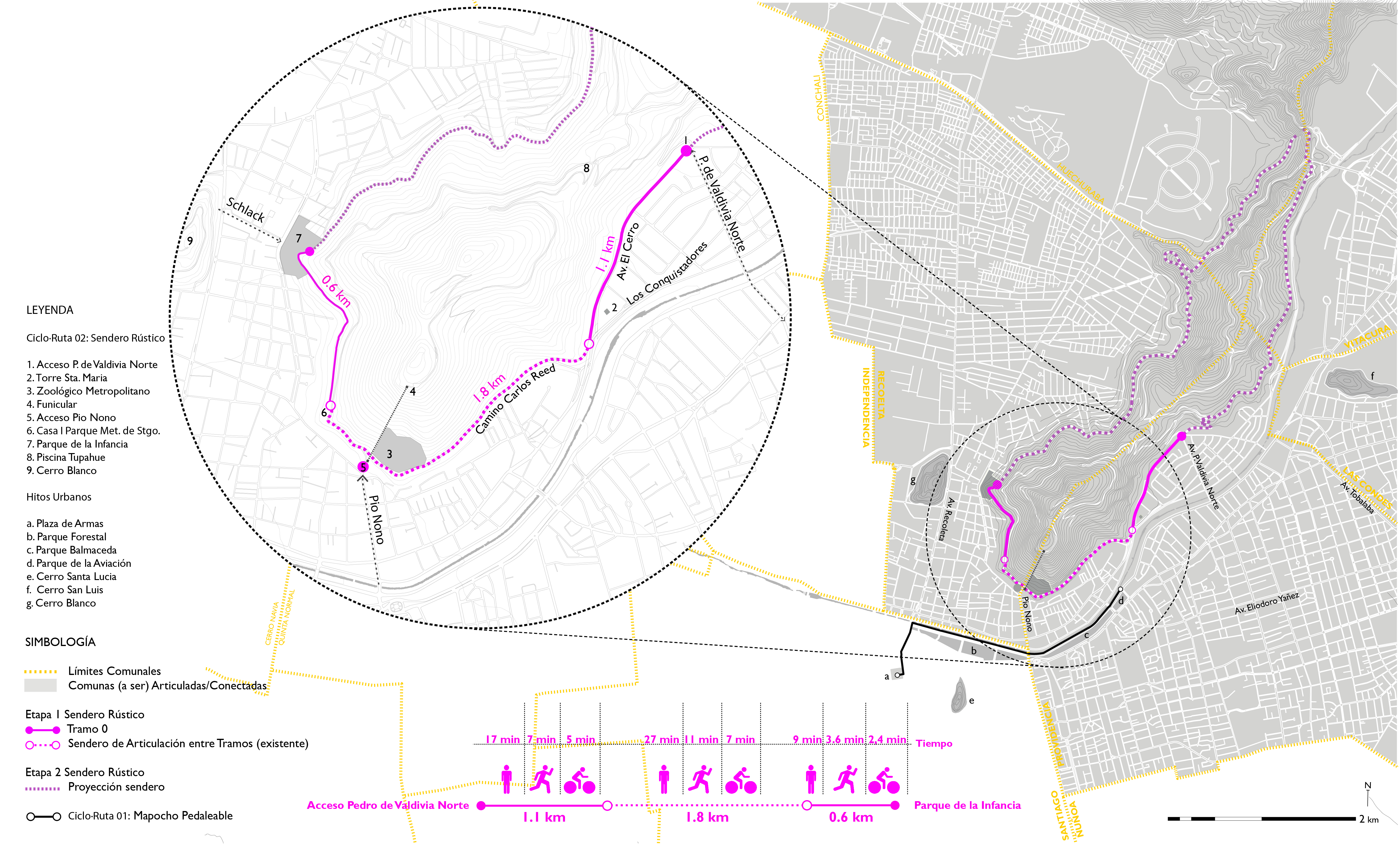 Si consideramos que desde 1925 el Cerro San Cristóbal se ha consolidado como un proyecto de parque a partir de la ejecución de una serie de intervenciones que han reconocido en él su potencial como espacio público, por una parte, y al menos en sus secciones consolidadas, el Sendero Rústico se establece como una infraestructura de conexión entre lugares o programas existentes y por otra, como una posibilidad de reconocer que hitos como el San Cristóbal poseen el potencial de articular la ciudad y de propiciar el encuentro de sus habitantes con la condición geográfica del valle.