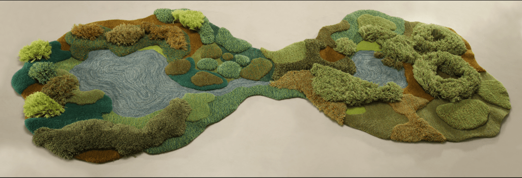 Las vanguardistas obras textiles de la argentina Alexandra Kehayoglou se inspiran en la pampa bonaerense, sin responder necesariamente a una lógica de diseño geométrico, sino a las perfectas irregularidades de un paisaje social e identitariamente identificado como verde y llano. Estos ideales propios de la concepción pictórica del paisaje, son utilizados para rememorar propiedades del paisaje exterior, en un interior.