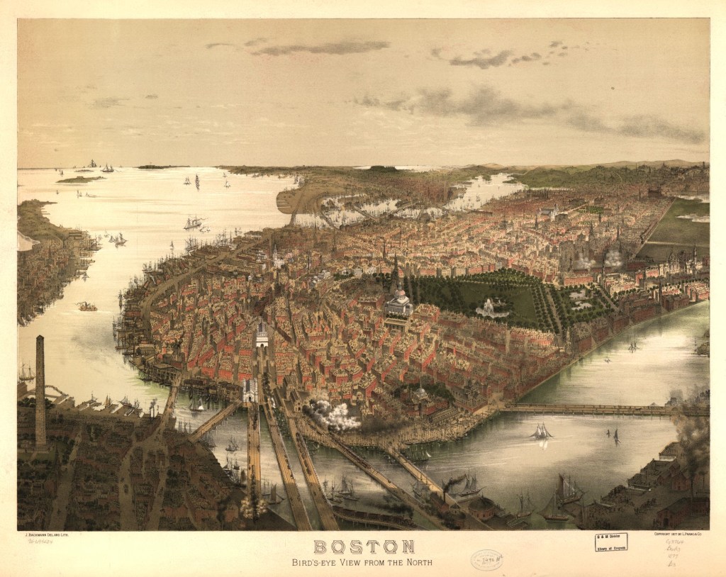 (3) John Bachmann, Boston Bird’s-Eye View from the North (1877) © Library of Congress. Nótese la concentración urbana en la península (Beacon Hill) y el inicio del Collar Esmeralda enfrentando al Río Charles y avanzando hacia el fondo de la imagen (o suroriente de la ciudad).