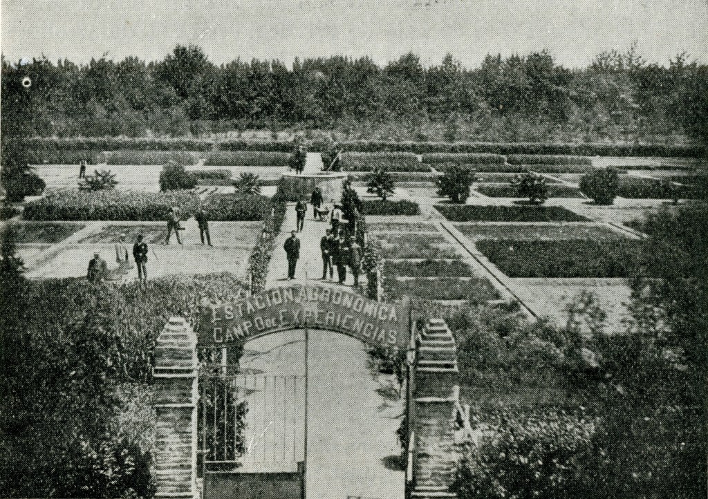 (5) Instituto Agrícola; Alumnos en el Campo Experimental de la Estación Agronómica [de la Quinta Normal de Agricultura] (c.1908). en Eduardo Poirier, Chile en 1908 (Santiago: Imprenta, Litografía y Encuadernación Barcelona, 1909), p.42
